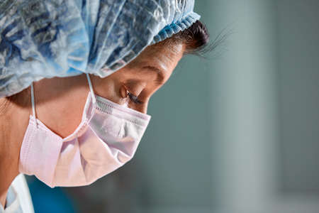 Close up portrait of female surgeon doctor wearing protective mask and hat during the operation. Healthcare, medical education, surgery concept.