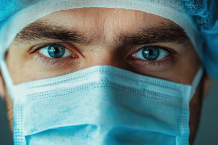 Male healthcare professional wearing surgical mask and cap, representing medicine, safety, and medical expertise in clinical care.