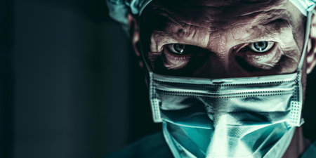 Close up profile of a focused surgeon wearing a surgical mask and round glasses, illuminated by dramatic low key directional light in an operating room. represents intense concentration, healthcare, and medical professionalism.