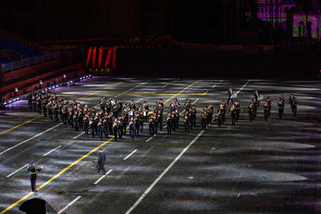 MOSCOW, RUSSIA - SEPTEMBER 01, 2021. Military band Festival, performance on Red Square with special effects and fireworks