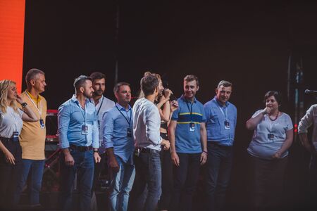 LVIV, UKRAINE - June 18, 2019: Vakarchuk at stage talking in microphone. political