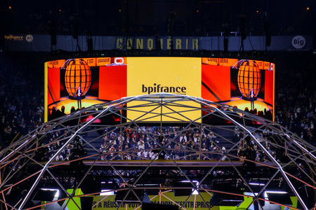 Paris, France - October 7, 2021: Steel dome at the Bpifrance Innovation Generation (BIG) business convention for investors and entrepreneurs at the Accor Arena in Paris Bercy - Event organized by the French Public Investment Bank