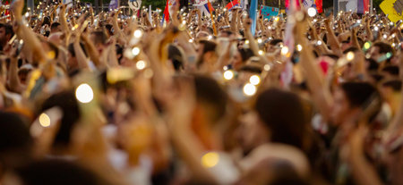 Blurred, unclear many people lift hand up hold mobile, cell phone with flashlight, light honoring the victims, 16 minutes of silence for lost lives in roof collapse, railway station in Serbia.