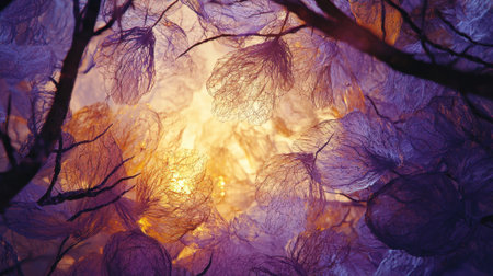 Translucent leaves in shades of purple and orange catch sunlight filtering through branches in a tranquil forest. This autumn scene evokes a sense of warmth and beauty.