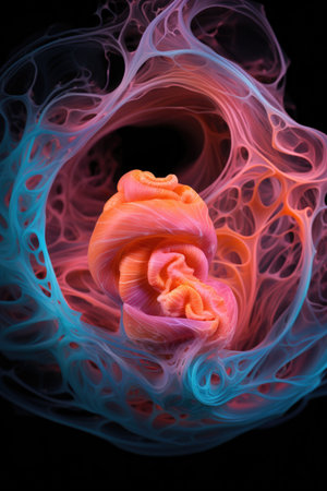 Thermal photography of an abstract, colorful pattern with heat waves in the style of Matisse. The color palette features neon pink and blue, with vivid colors. Captured using a macro lens, the image has an x-ray effect and a dynamic composition. Created using a redshift renderer, the result is hyper-realistic, with detailed textures and a cinematic, high-resolution appearance. --ar 3:2 --v 6.1 Job ID: 06163584-6a82-45d4-b422-f688ac3881ef