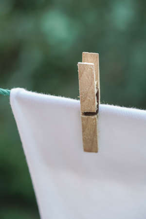 One wooden clothespin holding clothes on a rope. Drying on a wire, gently moved by the wind, housework concept. Copy, empty space for text.
