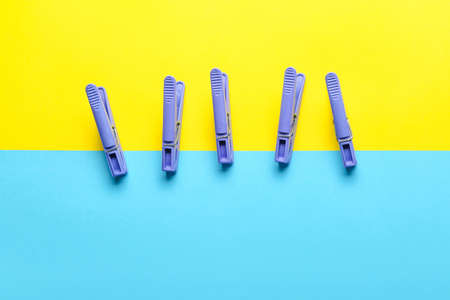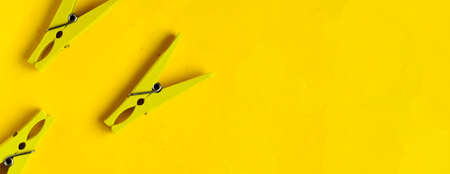 Decorative multicolored wooden clothespins on a yellow background. Flat lay composition