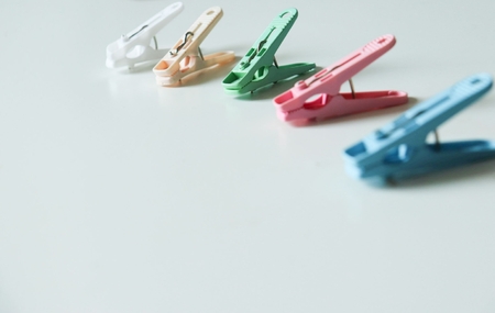 Hand holding row of colorful plastic cloth clamp or clip on white background