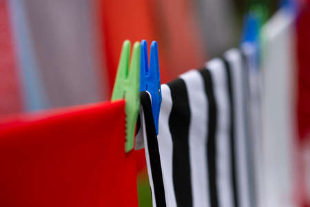 Colorful clothes hanging to dry on a laundry line. The focus is on the clothespins.