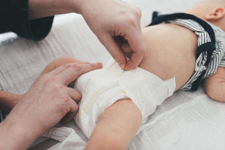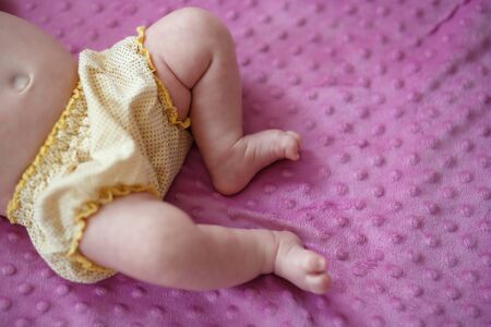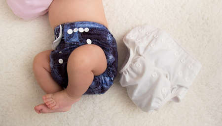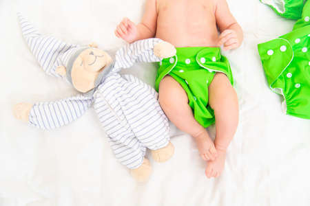 Baby wearing a white reusable diaper. Baby taking care and hygiene concept.