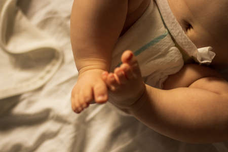 Newborn baby belly and legs in diaper, lying on white bed, top view, copy space