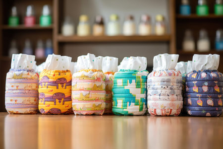 cute patterned disposable diapers arranged in a row, created with generative ai