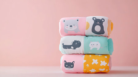 A charming stack of adorable baby diapers featuring cute animal designs, set against a soft pink background, perfect for children's care and nursery themes.
