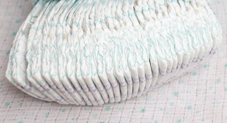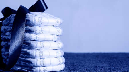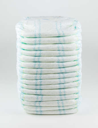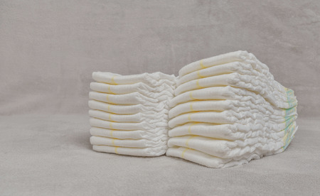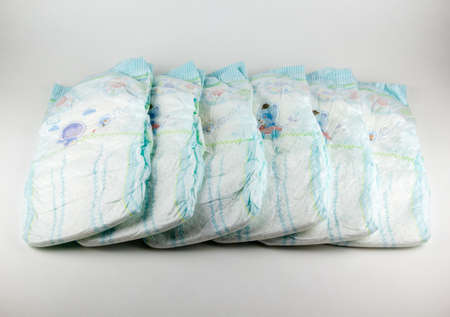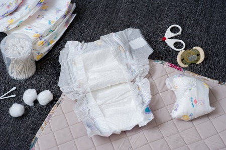 Group of disposable diapers arranged over a white changing table. Hygiene and health care for baby