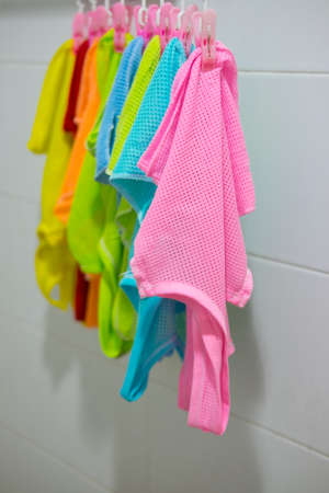 Colorful children's clothes are dried on the clothesline in the garden outside.