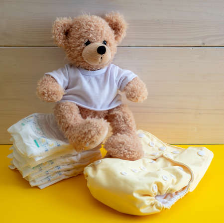 Baby diaper choice concept. Teddy sitting on cloth reusable nappy and disposable diapers, yellow color floor, wooden wall background. Eco friendly, alternative lifestyle