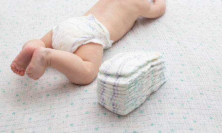 One-month-old baby lying next to a stack of diapers. How to choose the best diapers for your newborn. Baby care, diaper selection, and parenting essentials concept