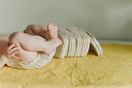 The legs of a baby in a diaper against the background of a stack of children's comfortable diapers.