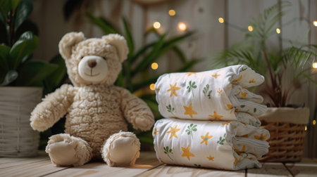zero waste cloth diapers with playful patterns, accompanied by a soft teddy bear on a light wooden background, highlighting eco-friendly baby essentials.