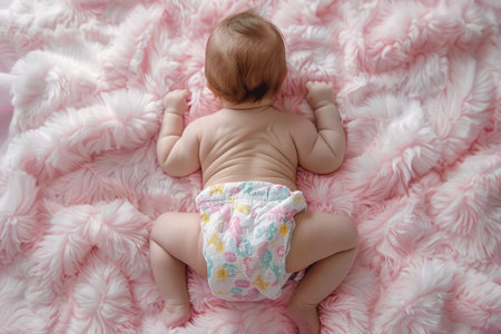 A small baby in a diaper lies on his stomach on a soft pink blanket.