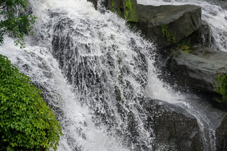 Close up of the waterfalls of Elephant Falls of shillong, Meghalaya with green trees and sunlight, rocks, selective focusing