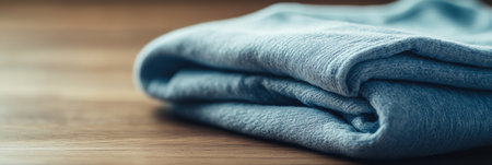 Soft, minimalist sportswear is carefully folded on a smooth wooden table, ready for an active lifestyle and fitness routines anytime.