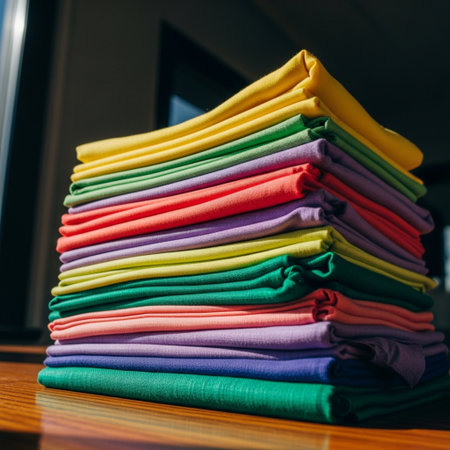 An arrangement of neatly folded textiles highlighting lively hues alongside soft, muted shades, perfect for inspiring creative projects or cozy interior accents.