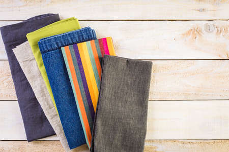Garments are neatly folded and arranged on a table corner with an empty backdrop to highlight the colors and styles for promotional use.