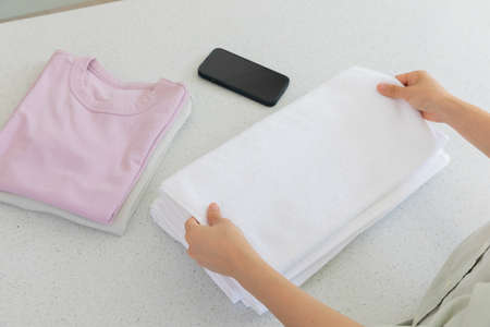 A selection of organized folded clothes and jeans on a white surface, with hands and a wristwatch visible in soft studio light.