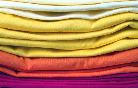 Stack of colorful perfectly folded clothing items. Pile of different pastel color shirts, sweaters isolated and other garments on white background. Close up, copy space.