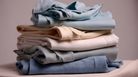 A stack of neatly folded spring clothing items rests in a corner of a studio. The neutral background offers a clean space for design purposes.