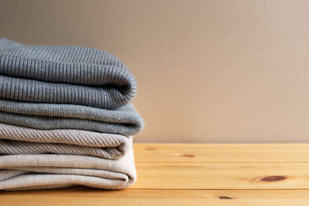 Pile of warm sweater clothes on wooden table. Autumn and winter concept. with copy space