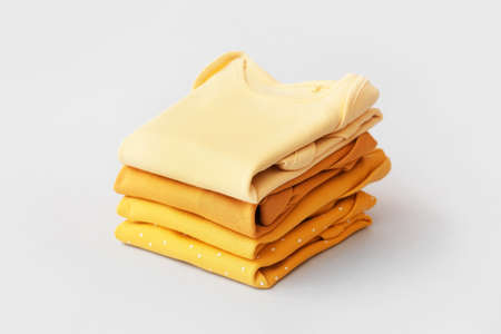 Cropped view of stack of folded colorful clothes on gray surface, side view, space for text. Brown, gray and yellow color tone. High quality photo