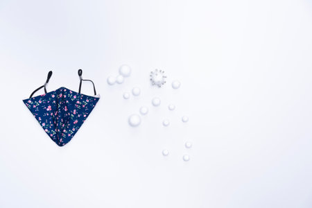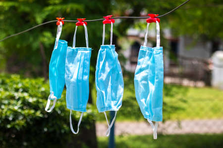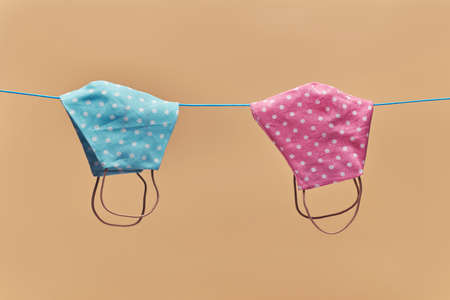 Fabric masks to protect from Covid-19, worldwide pandemic in 2020 and 2021hanging on a wash, empty copy space for text, isolated on a white background