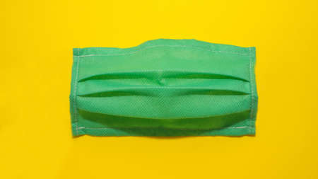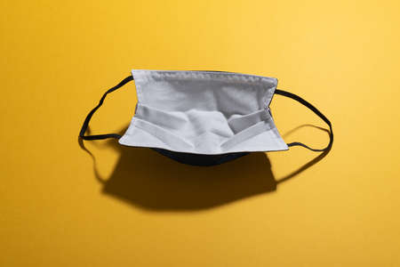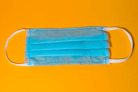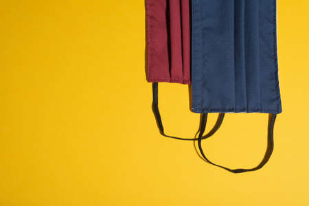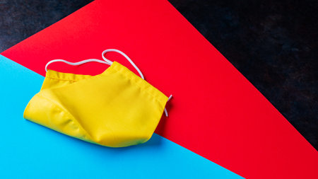 Yellow face mask on multicolored paper. Face protective mask on blue red background. Reusable antivirus mask. Copy space
