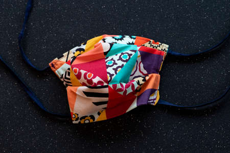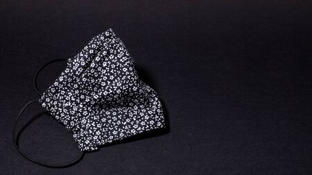 Folded in half textile handmade medical mask with black and white floral pattern on black backdrop with copy space. Mean of personal protection against virus. Covid-2019. Self-safety during Pandemic.