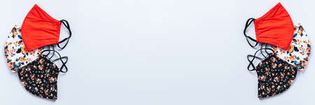 Fashionable protective face masks collection on white background, top view, copy space. New normal accessories for staying healthy and protected. Face mask as fashionable accessory