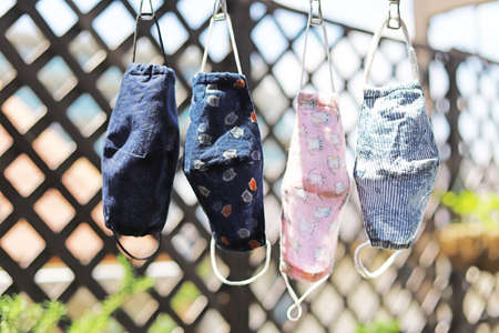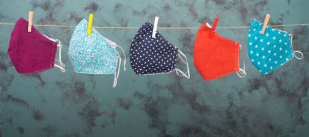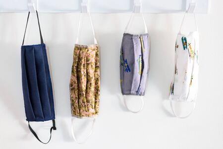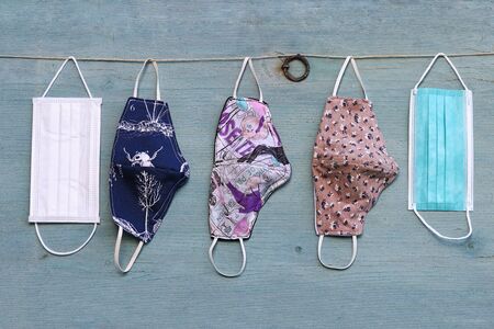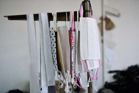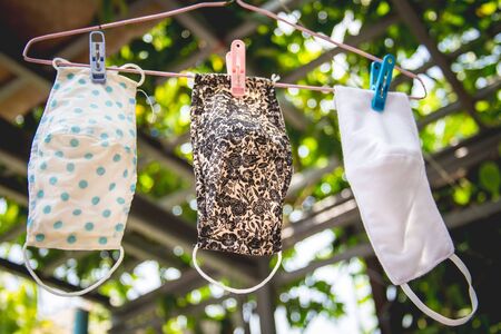 Colorful washable reusable fashion face masks hanging on the clothes hanger. Making DIY cloth masks to prevent the outbreak of the covid-19 virus has become a popular fashion throughout Thailand.