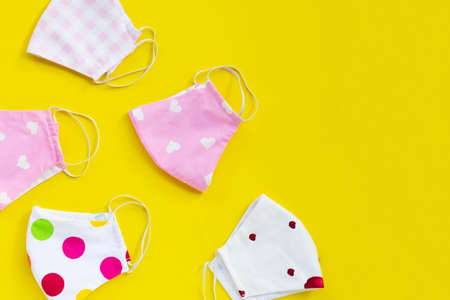 Handmade face protective masks on yellow flat lay background. Reusable face masks against virus or flu. Pattern of medical mask