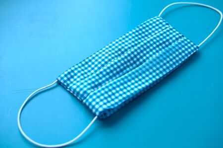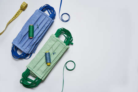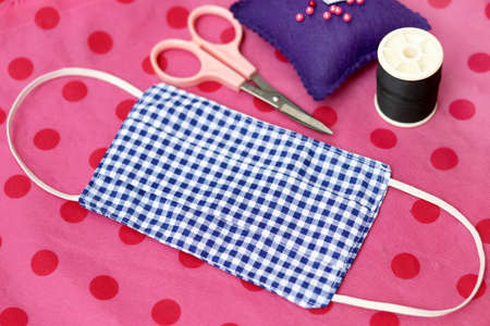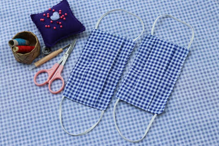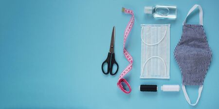 Sewing reusable and washable cotton mask during coronavirus or infection or allergy. Thread, scissors, measuring tape and blue-and-white striped mask on blue background. DIY,Handmade product.