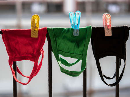 06 Jun 2020 Colorful COVID 19 Different colors of washable face masks hanging to dry Lokgram Kalyan Maharashtra India
