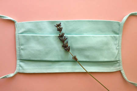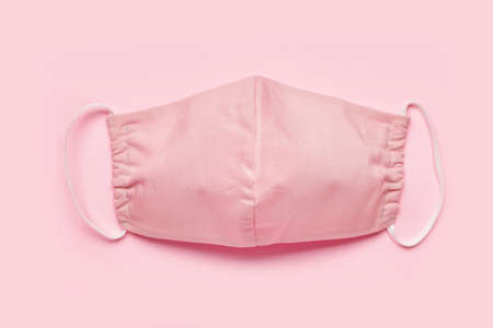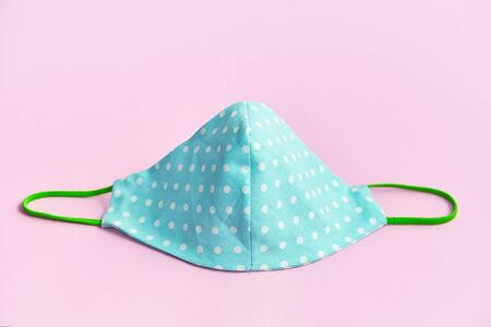 Blue disposable face mask on a pink background. Medical mask top view copy space. Quarantine during the crown of the virus remedies.