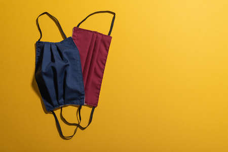 Red and dark blue facemasks flat lay on mustard yellow plain background. Poster template with copy space