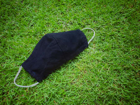 Cloth mask made of cotton fabric isolated on green grass with copy space.Wear it to protect against Covid 19 virus and PM.25