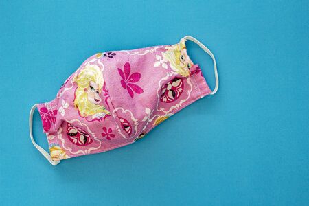 Blue and orange color face mask made from cloth placed on white background. Medical type mask for coronavirus protection