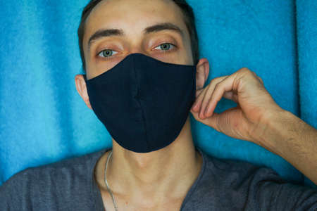 Young man decided to wear grey color KN-95 face mask. Blue shirt guy. Corona virus pandemic. Wear mask before you go out