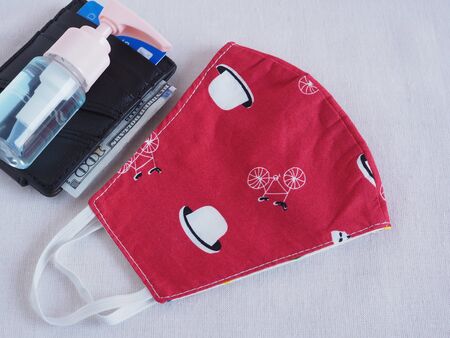 Red fabric face mask to prevent pollution and viruses. DIY handmade from cotton muslin with alcohol gel in the bottle and money clip on white background. Healthcare and New normal concept.