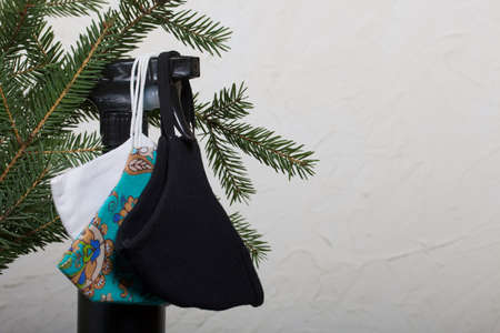 Medical masks hang on the branches of a green spruce. Antiseptic spray nearby. Against a background of white plaster.