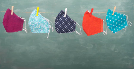 the new normal after the covid-19 virus outbreak and pandemic, reusable fabric face mask just washed and hung to dry on clothes airer