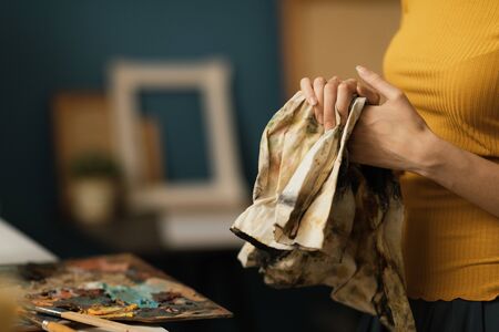Inspiration and creativity. Cropped shot of female artist taking break, sitting with hands and jeans dirty with colorful paint.